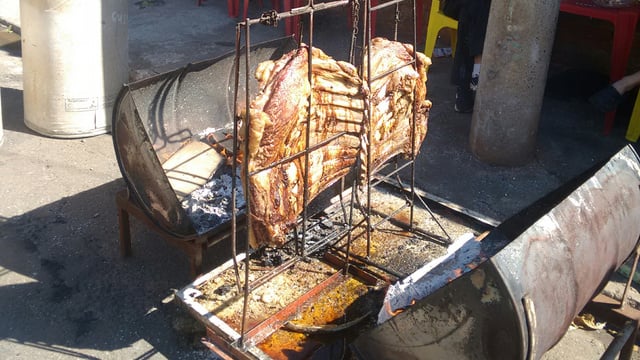 Espete uma costela de aproximadamente 15 kg no espeto especial para esse tipo de costela.