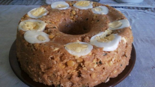 Em uma forma média (com buraco no meio) coloque rodelas de ovos cozidos no fundo e acrescente a massa pronta do cuscuz pressionando com uma colher grande para cobrir toda a forma.