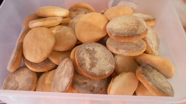 Faça uma calda de açúcar e água para molhar as bolachas, em seguida passe no açúcar refinado.