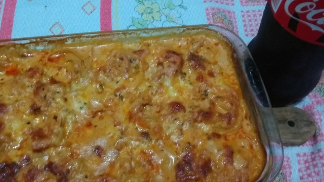 Dicas: Se preferir use o presunto e mussarela de ralados. A água não deve secar, apesar de ao tirar o macarrão do forno ele estará bastante aguado, porém em alguns minutos o caldo engrossa.