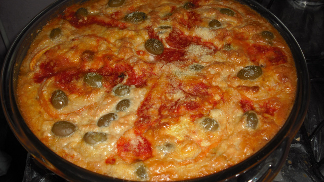 Unte com óleo um refratário, coloque um pouco da massa e coloque o refogado e por cima o restante da massa e decore com cebola e azeitona (opcional) e leve ao forno para gratinar.