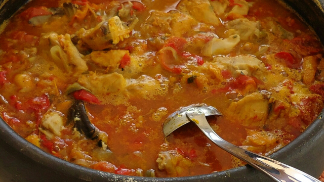 Utilizando uma panela de barro grande coloque: 2 colheres de óleo, 1 de azeite, cebola, coentro , tomate, pimenta (tudo bem picadinho) e o alho amassado.